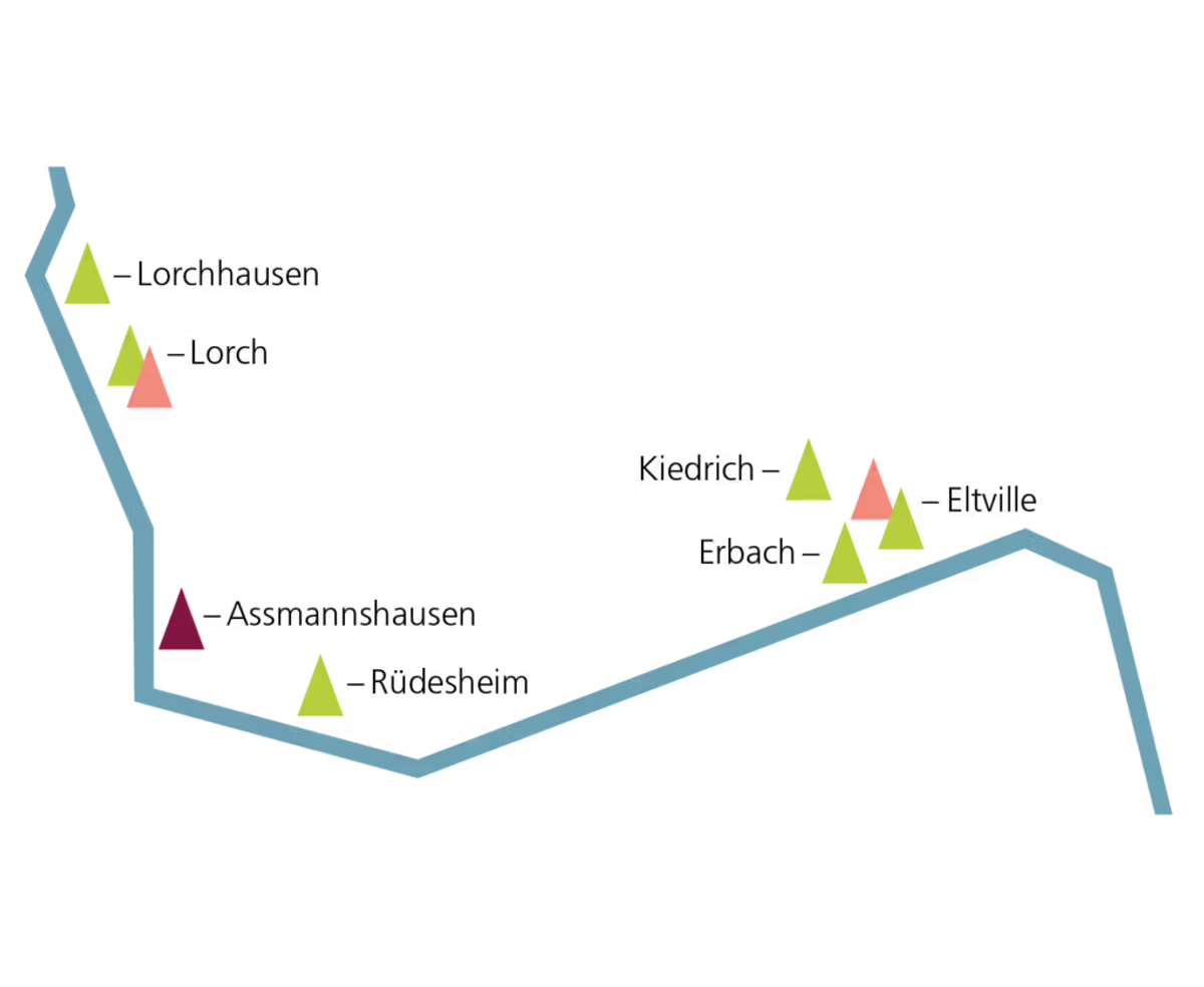 Kiedricher Sandgrub, Erbacher Hohenrain, Michelmark und Honigberg, Rüdesheimer Roseneck, Schlossberg, Drachenstein, Klosterberg und Magdalenkreuz, Assmannshäuser Höllenberg und Frankenthal und die Lorcher Lagen Krone, Pfaffenwies sowie Bodenthal.