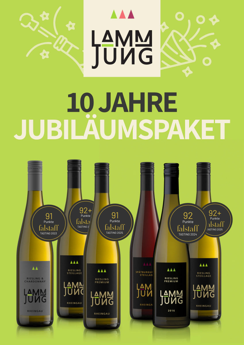 Seit einem Jahrzehnt steht das Weingut Lamm-Jung für charakterstarke Terroir-Weine und kompromisslose Qualität aus dem Rheingau. Zu unserem 10-jährigen Jubiläum haben wir für Sie ein Paket geschnürt, das unsere Geschichte erzählt – von den tief verwurzelten Alten Reben bis zu den präzisen Weinen aus der Steillage.